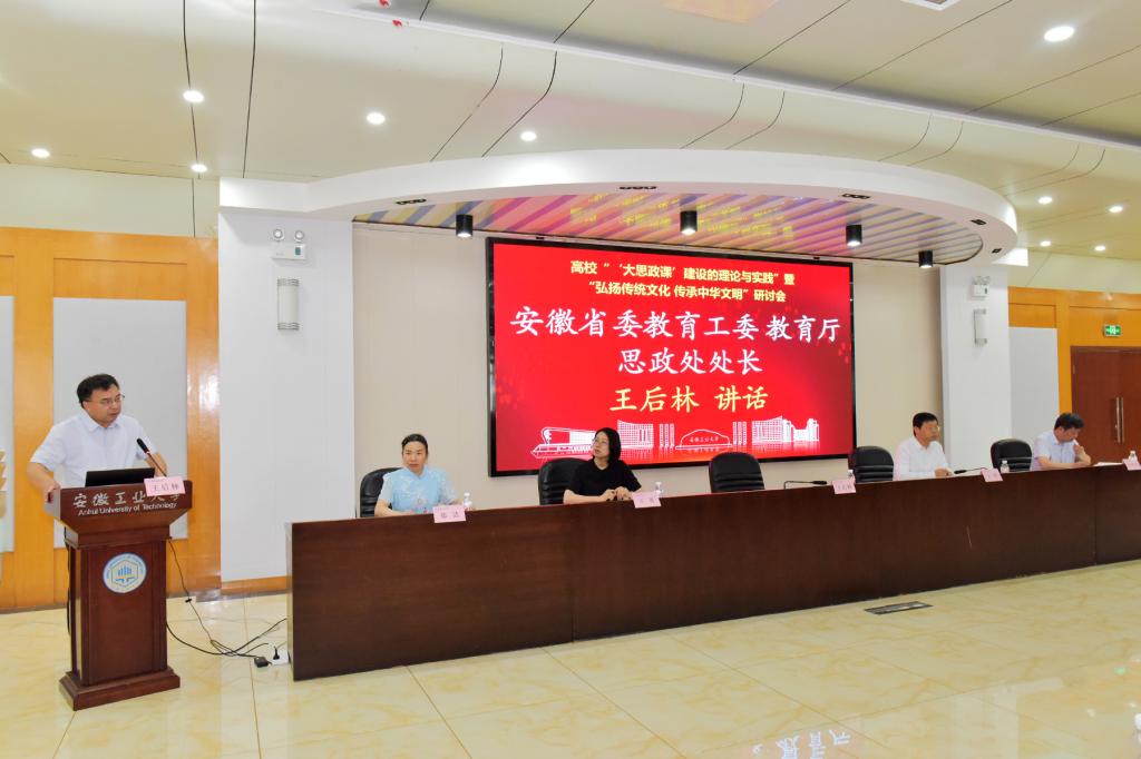 王后林在讲话中代表省委教育工委、省教育厅,向本次研讨会的顺利召开表示热烈祝贺,对安徽工业大学的大思政课建设给予高度肯定,对如何发挥好市域特色资源优势、进一步明确“大思政课”建设目标提出了指导意见。他指出,推进高校“大思政课”建设责任重大、使命光荣,要紧扣时代脉搏,赓续中华文明薪火,努力培养担当民族复兴大任的时代新人,并强调要在视野上拓展“广度”、在资源上挖掘“深度”、在方法上提升“效度”,推动“大思政课”与中华优秀传统文化、中华文明探源成果深度融合、双向赋能,协同发力、久久为功。希望广大理论专家和知名学者为我省的“大思政课”建设提供更多智慧与指导。