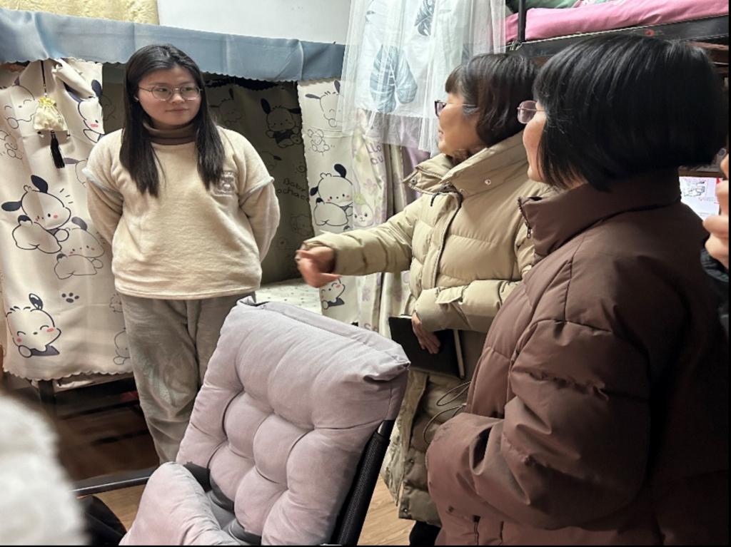 在走访过程中,老师与同学们亲切交谈,仔细查看了解学生宿舍的生活设施、用电安全、宿舍卫生环境等情况,详细地询问了同学们假期生活、学业进展、思想状况和在生活学习上遇到的困难和问题,叮嘱每位同学要遵守学校宿舍相关管理规定,注意维护好宿舍环境卫生特别是注意宿舍用电安全,强化安全意识。老师们鼓励同学们之间要相互理解,相互包容,团结友爱,努力营造一个安全、卫生、文明、和谐的宿舍环境。同时勉励大家要珍惜学习时光,把握大好机遇顺势而为,加强系统理论学习和学术研究,增强自身的专业知识,加强体育锻炼和社会实践,为将来走进社会打下坚实的基础。