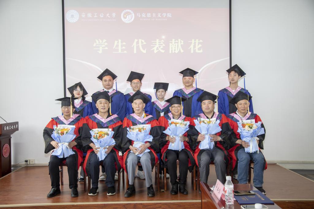 在拨穗授位环节,毕业生们依次登台,马克思主义学院院长为毕业生拨正流苏和颁发证书,并合影留念。毕业生们脸上洋溢着喜悦的笑容,享受着美好的时光并对未来充满了希望。马克思主义学院全体硕士毕业生向学院赠献“厚德育人,桃李天下”的牌匾,表达了2024届全体毕业生对学院的感恩与祝福,学院也向全体毕业生赠送毕业纪念品,愿全体毕业生的智慧如它般无限扩展,生活更加精彩纷呈。师恩难忘意深浓,桃李人间茂万丛。随后,毕业生向导师一一献花致谢,感谢恩师一直以来的教诲和陪伴、付出与指导,感怀与老师从相遇到分别的不舍之情。