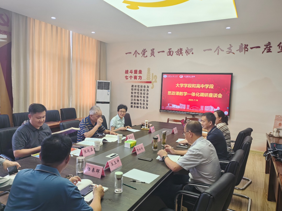 7月16日下午,马克思主义学院组织开展大学学段和高中学段思政课教学一体化交流座谈会,会议邀请了马鞍山市大中小学思政教育一体化建设研究中心吴望民,市第二中学特级教师、正高级教师李丽和市学科带头人张起磊来学院交流指导。学院副院长林忠心、副院长倪松根和教师代表王玉坤、陆春晖、孙文静、庞东霞参加会议。会议由林忠心主持。