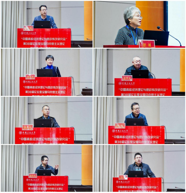在四场平行论坛上,围绕学习贯彻习近平经济思想、中国式现代化与进一步全面深化改革、多视角下的新质生产力、马克思主义政治经济学基础理论与前沿问题等议题,40位与会代表作了专题报告。在院长论坛环节,中国科学技术大学马克思主义学院院长刘立教授、陕西科技大学马克思主义学院院长吴明永教授、济南大学马克思主义学院院长杨立志教授、东华理工大学马克思主义学院院长华启和教授、重庆机电职业技术大学马克思主义学院院长徐茂华教授、河南科技大学马克思主义学院院长蔡中华教授、浙江农业商贸职业学院马克思主义学院院长丁菁教授、台州学院马克思主义学院院长张天华教授分别以“构建中国特色社会主义政治经济学自主知识体系框架初探”“深刻把握习近平经济思想的世界观和方法论”“促进思政课堂和社会课堂有效融合的路径探索”“‘概论课’讲好中国生态文明建设故事”“关于党的二十届四中全会精神融入中国近现代史纲要课的思考”“学习党的二十届四中全会精神的几点体会”“中国式现代化建设进程中的共同富裕基层实践”“习近平经济思想与‘第二个结合’”为题先后进行了研讨交流。