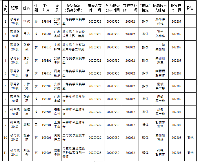 经马克思主义学院研究生党支部研究,拟吸收汪欢等11位同志为中共预备党员,现将他们的有关情况予以公示,欢迎广大党员、干部、群众通过信函、电话或直接到党支部或上级党组织反映公示对象的思想品质、现实表现、廉洁自律、培养教育等方面情况。