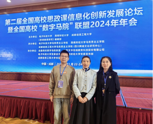 2024年11月23日至24日,第二届全国高校思政课信息化创新发展论坛暨全国高校“数字马院”联盟2024年年会在成都举行。本次年会由电子科技大学、西南财经大学、成都信息工程大学、《思想教育研究》编辑部联合主办。来自全国200余所高校的专家学者汇聚一堂,共话数字马院建设,探讨信息化时代的思政课创新发展。马克思主义学院院长郑洁、青年教师许醴和沈先陈受邀参会。