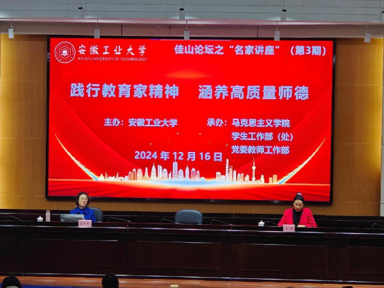 12月16日,由安徽工业大学主办,马克思主义学院、学生工作部(处)、党委教师工作部承办的佳山论坛之名家讲座第3期在佳山校区学术会议中心四楼报告厅举行,本期讲座邀请全国模范教师、全国高校思政课名师工作室负责人、河北大学“坤舆学者”、马克思主义学院原副院长柴素芳教授做了题为“践行教育家精神 涵养高质量师德”的讲座。院长郑洁主持活动,马克思主义学院全体师生、各学院分管学生工作党委副书记、全体辅导员参加。